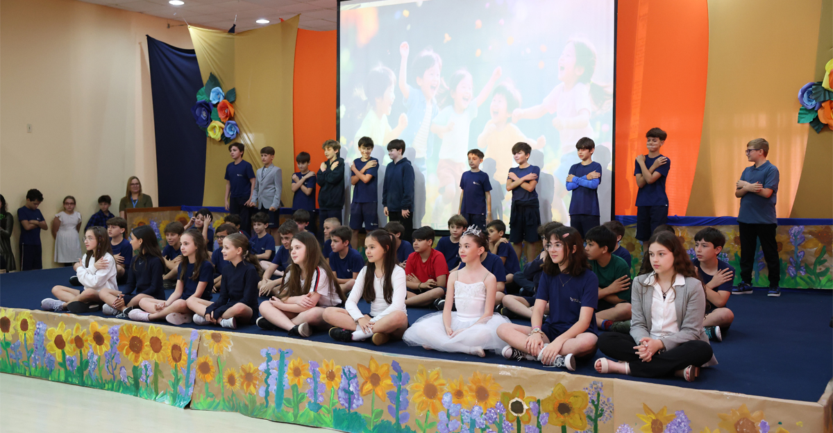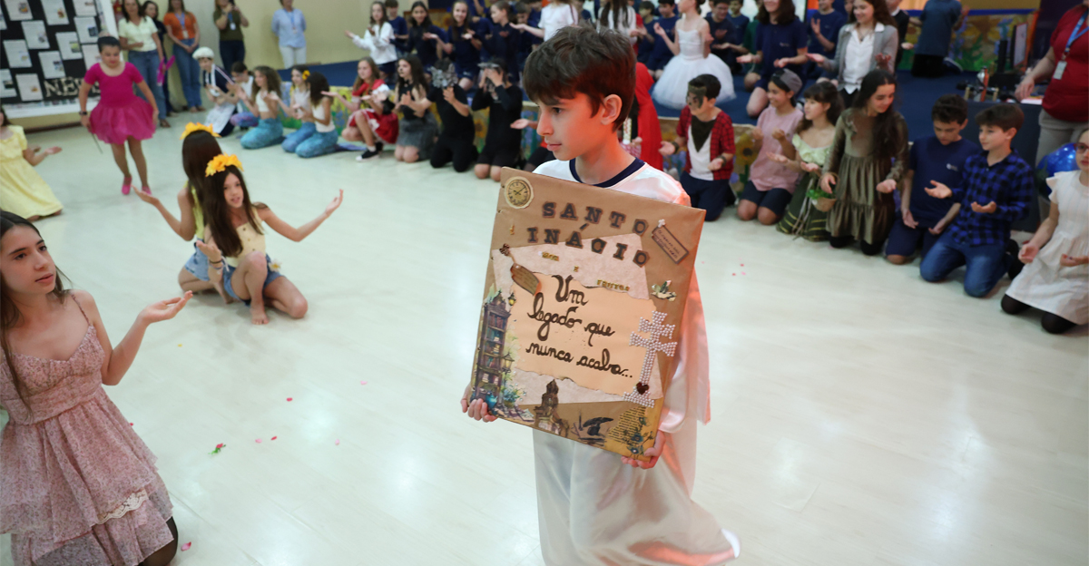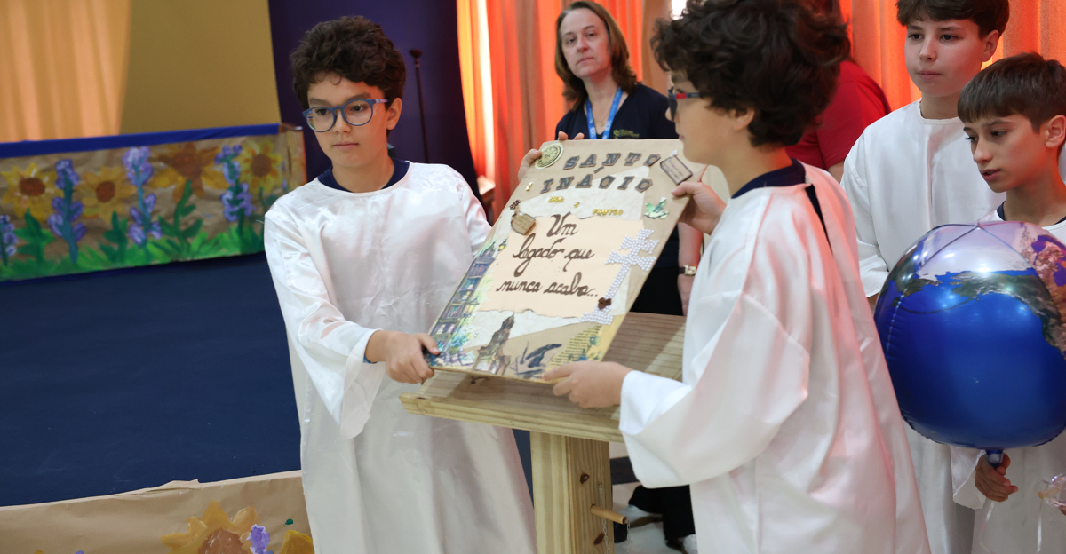 A manhã teve início com a acolhida das famílias pelas professoras regentes, seguida por um momento de espiritualização. Os alunos do 5º ano conduziram a oração, expressando gratidão pelo ano, pela escola, pelos 120 anos de história do Colégio e pelo legado de Santo Inácio, com seu convite a buscar o Magis — o melhor de si. Na sequência, as turmas foram convidadas a ‘contar, de forma poética, um pouco das atividades desenvolvidas’.