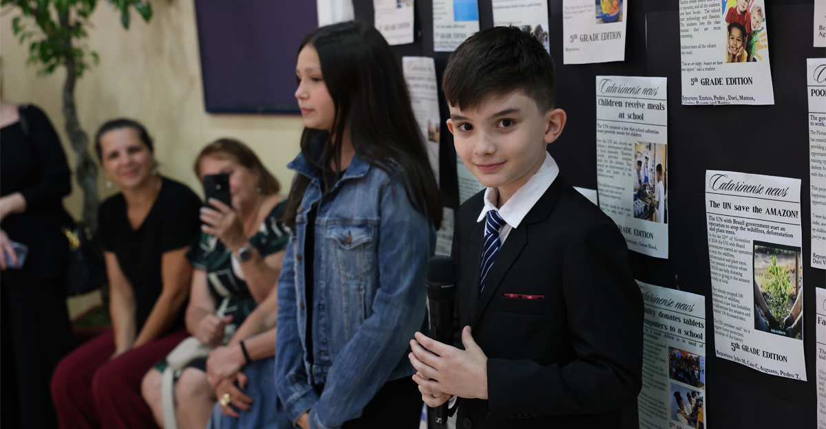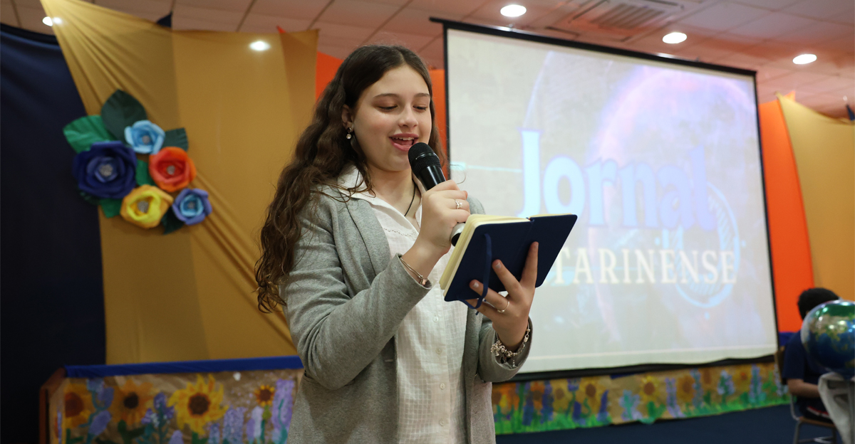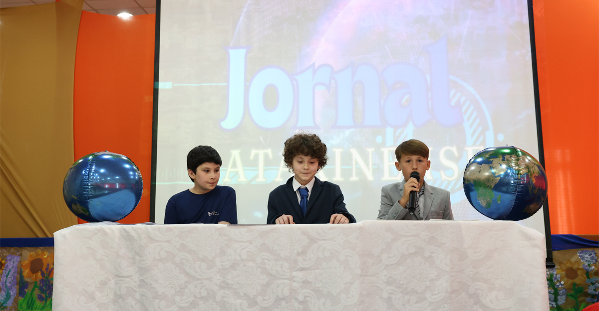 O ponto alto da Socialização foi a apresentação especial em formato de telejornal, intitulada “Jornal Catarinense – Notícias da nossa Casa Comum!”. Com uma vinheta introdutória, o noticiário escolar levou os presentes a uma “viagem” pelas diferentes áreas do conhecimento, chamadas poeticamente de “nações” ou “países”: