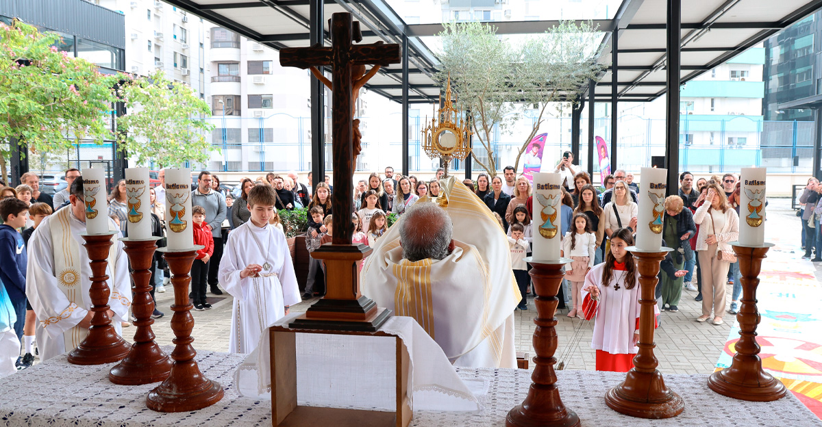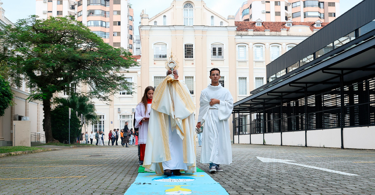 A comunidade educativa do Colégio Catarinense reuniu-se na Igreja Santa Catarina de Alexandria para celebrar a solenidade de Corpus Christi, com missa seguida da solene procissão nesta quinta-feira, dia 19 de junho.