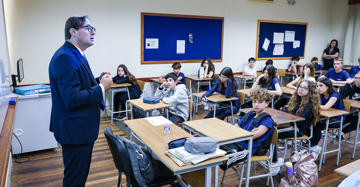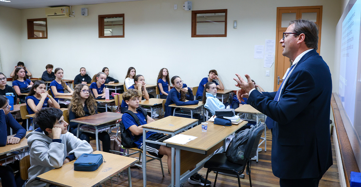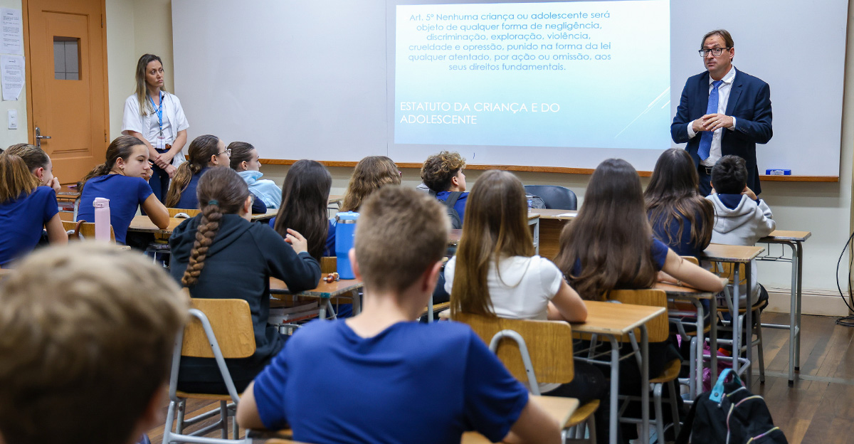 Com foco na formação de valores e no desenvolvimento de comportamentos assertivos, os alunos do 7º ano do Colégio Catarinense receberam, nessa quarta-feira, dia 16 de outubro, a visita do Juiz da Vara da Infância e Juventude da Capital, André Milani. O magistrado participou de uma conversa para refletir sobre os complexos impactos de condutas como bullying, cyberbullying, capacitismo e violência contra a mulher.