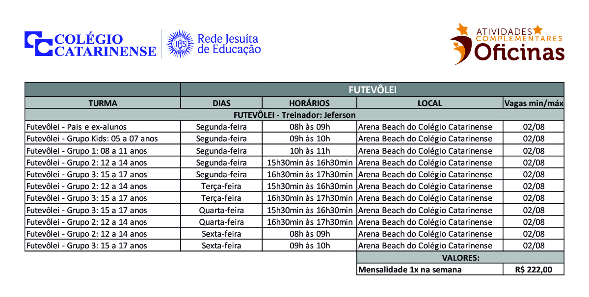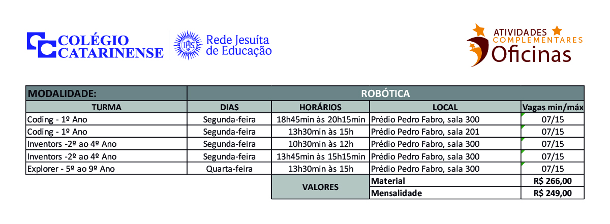 A ideia das atividades extracurriculares é ir além da sala de aula e, dessa forma, desenvolver no aluno a capacidade de lidar com suas emoções, objetivando seu crescimento emocional e cognitivo, para que ele saiba agir emocionalmente a partir do seu pensamento. Para isso, o Colégio Catarinense oferece várias oficinas, escolinhas e treinamentos para seus educandos, nas mais diversas áreas e modalidades.