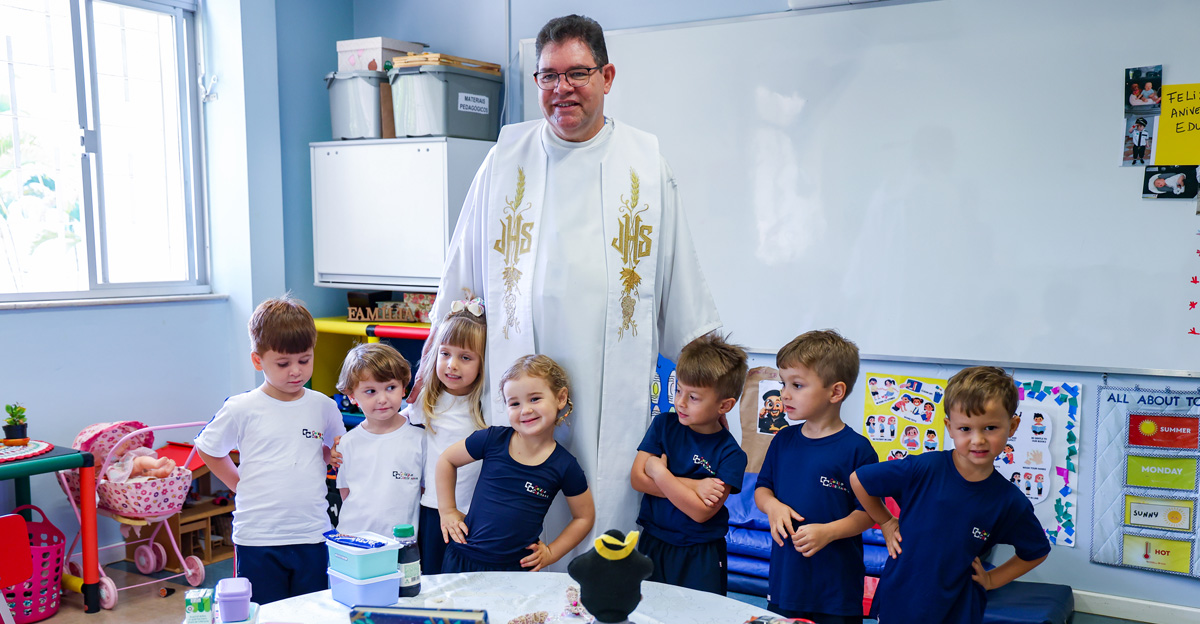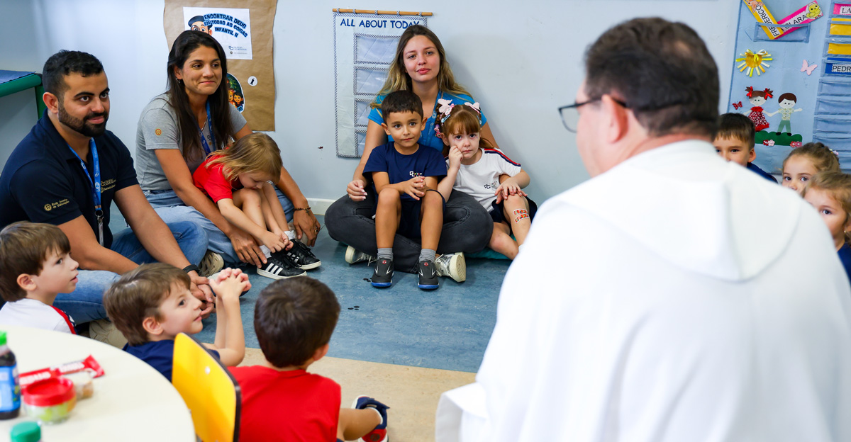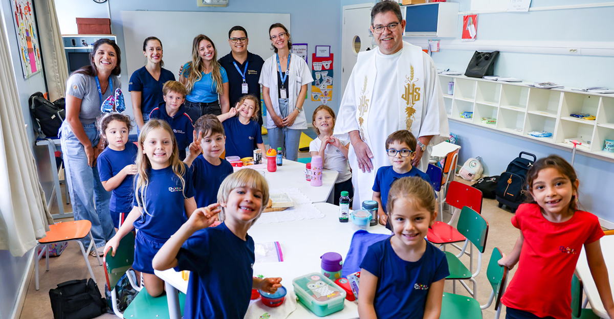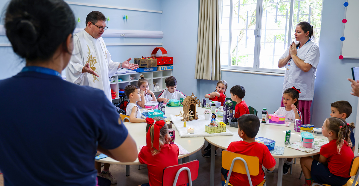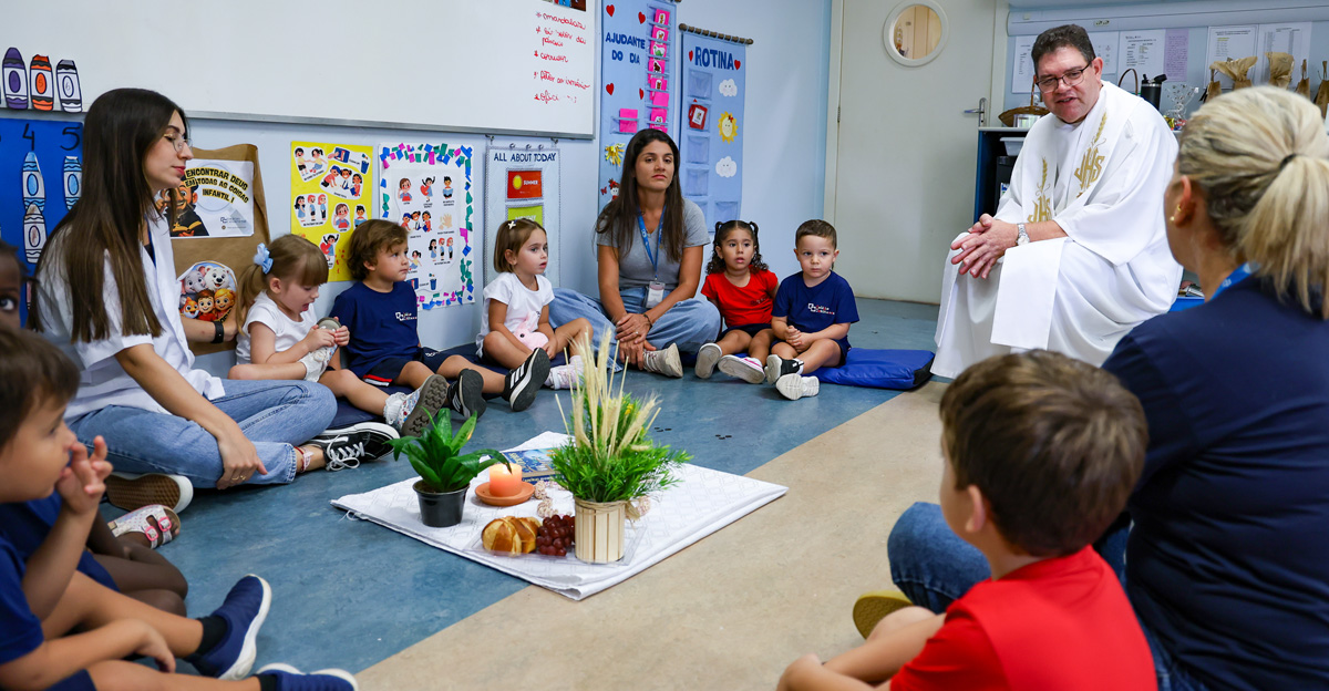 Na Educação Infantil, as crianças participaram de um momento conduzido pelo Pe. Elcio José de Toledo, SJ, que apresentou, em linguagem acessível, o significado da Páscoa a partir da experiência de Jesus com seus discípulos. Inspirados pela recordação da Santa Ceia, os alunos foram convidados a refletir sobre gestos concretos de amor, partilha e cuidado com o próximo. Ao final, os alimentos trazidos pelas crianças foram abençoados, em um sinal de gratidão e comunhão.