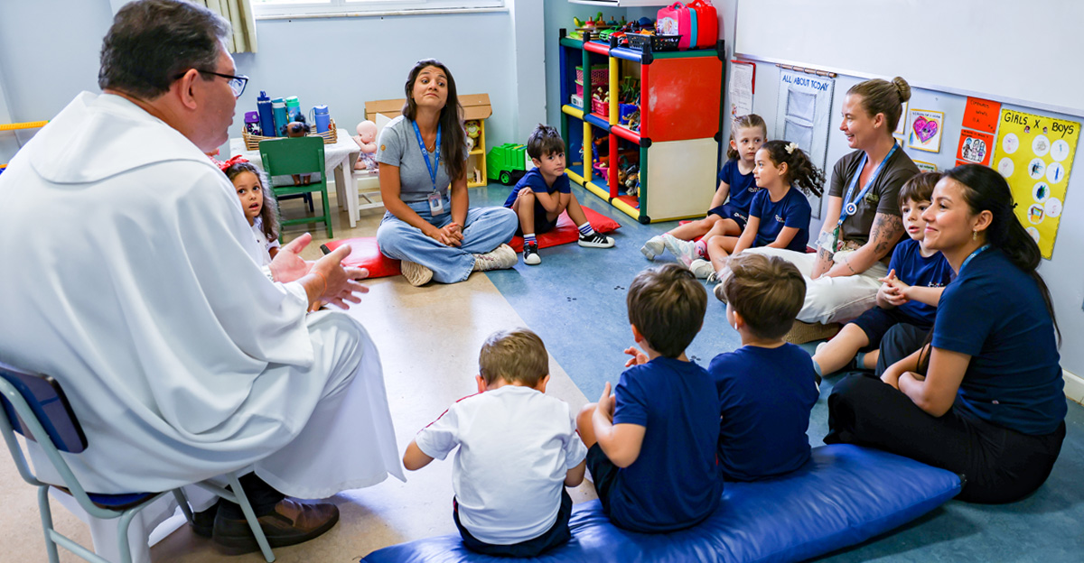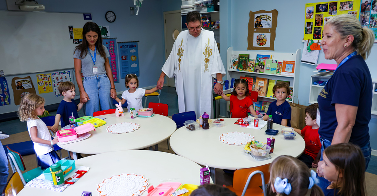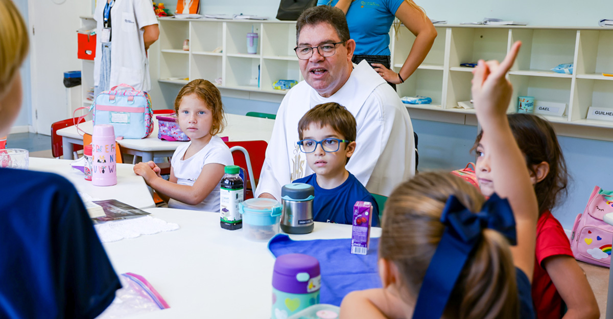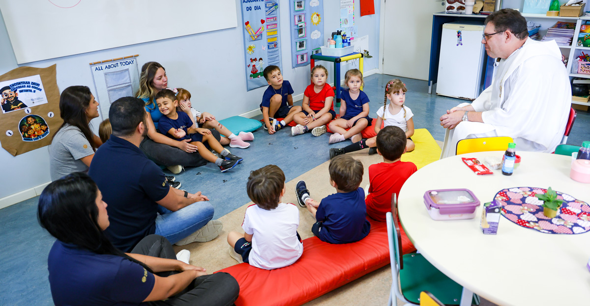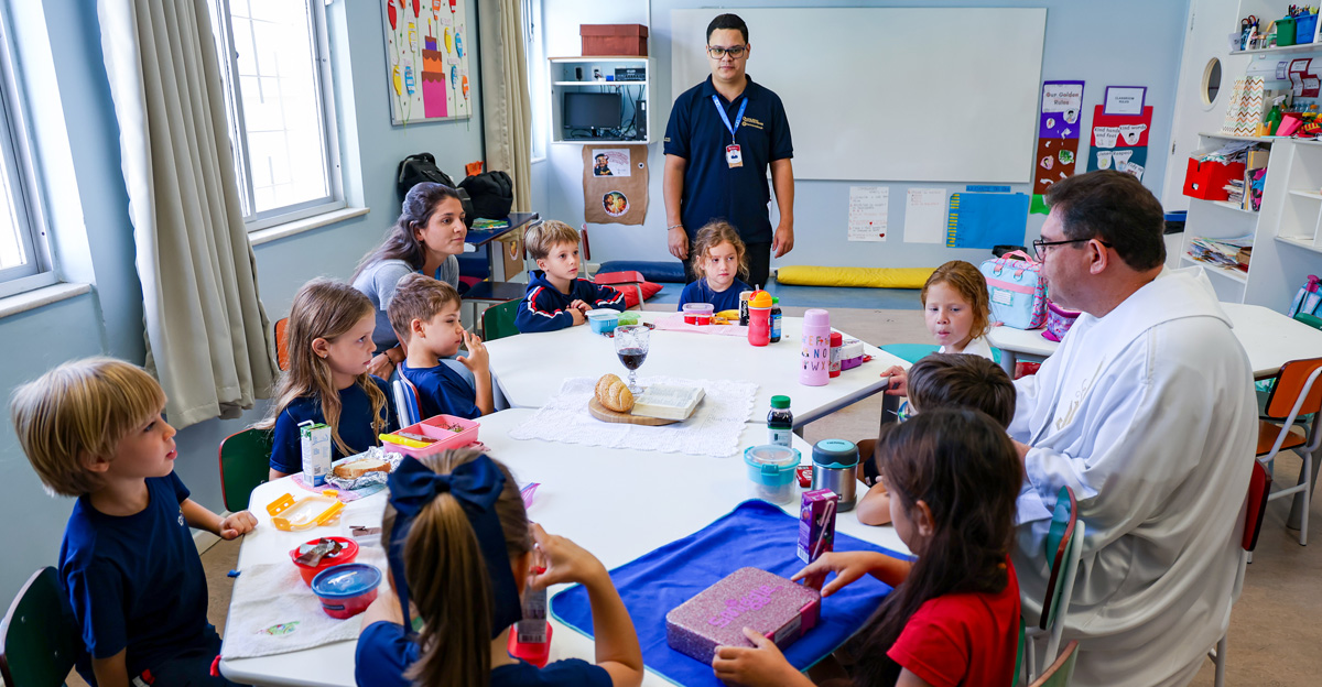 Na Educação Infantil, as crianças participaram de um momento conduzido pelo Pe. Elcio José de Toledo, SJ, que apresentou, em linguagem acessível, o significado da Páscoa a partir da experiência de Jesus com seus discípulos. Inspirados pela recordação da Santa Ceia, os alunos foram convidados a refletir sobre gestos concretos de amor, partilha e cuidado com o próximo. Ao final, os alimentos trazidos pelas crianças foram abençoados, em um sinal de gratidão e comunhão.