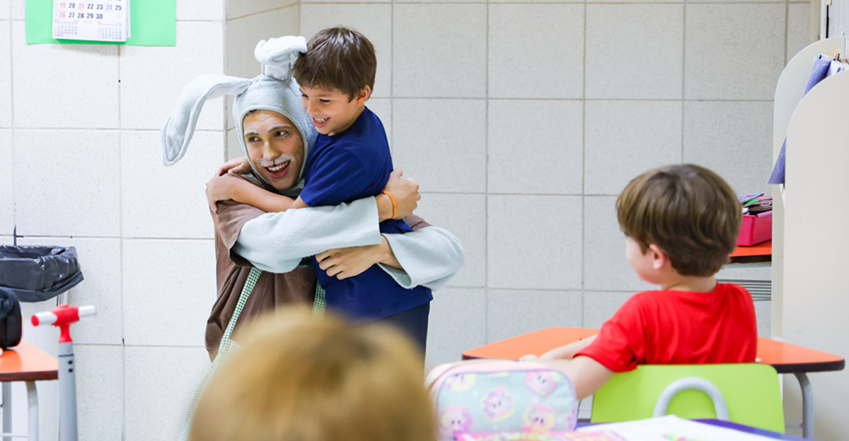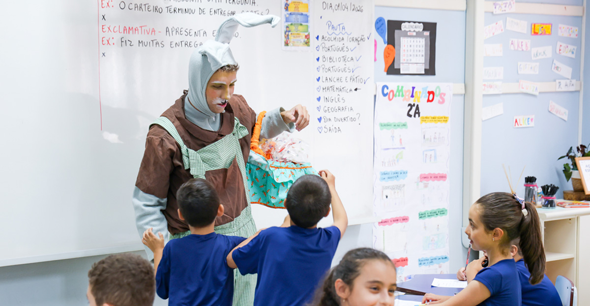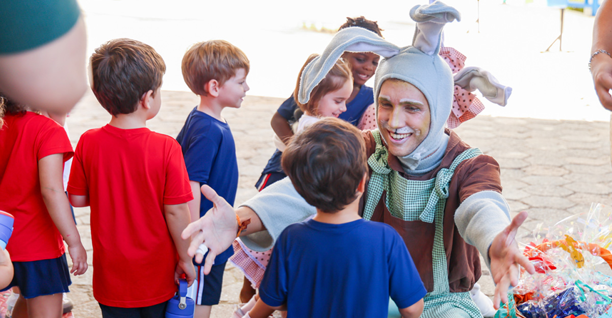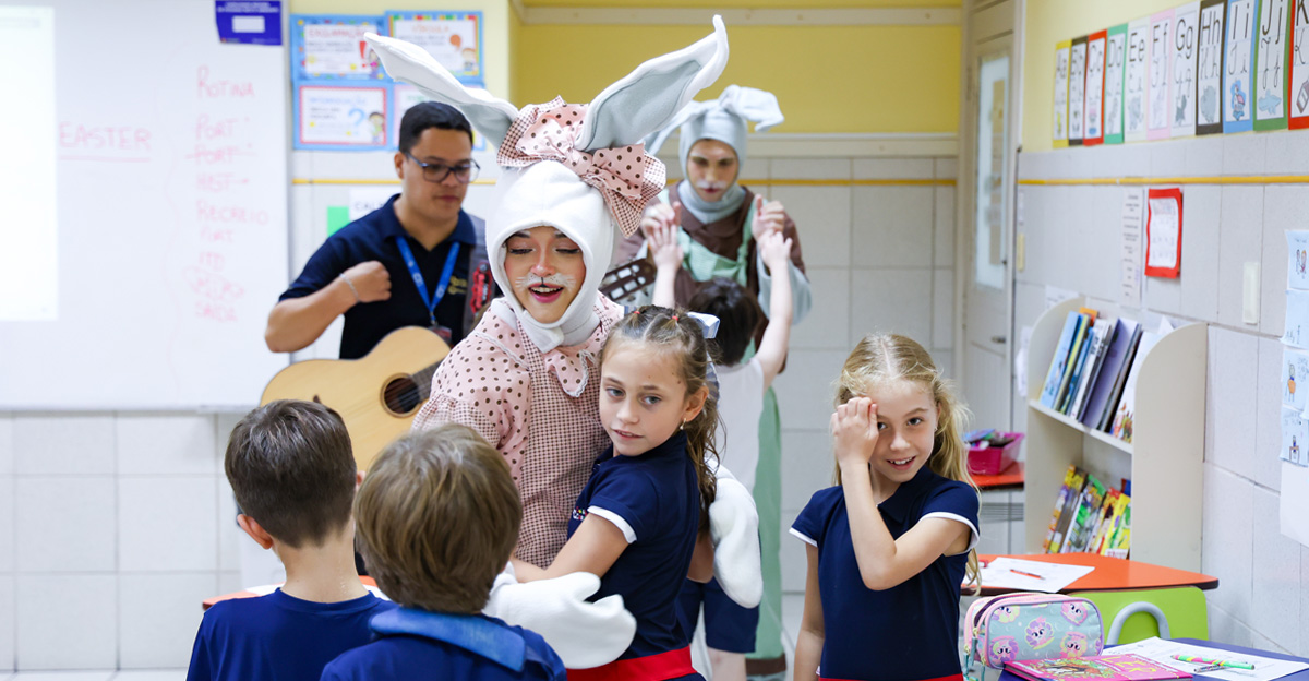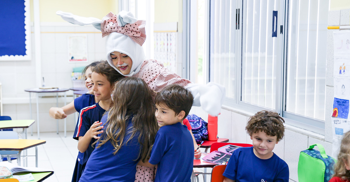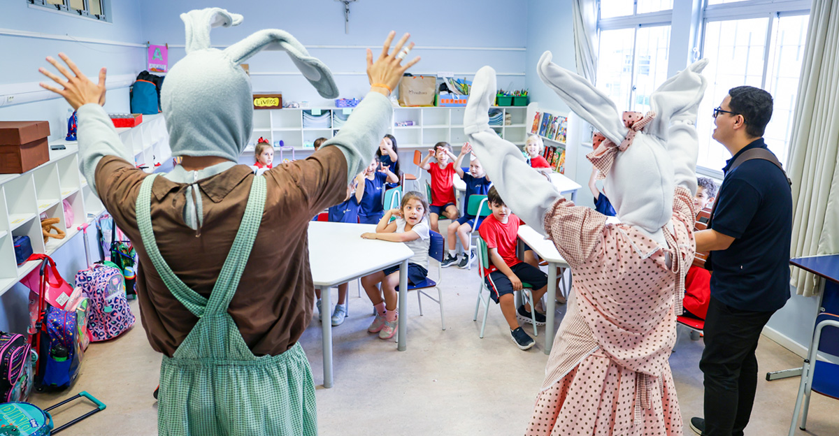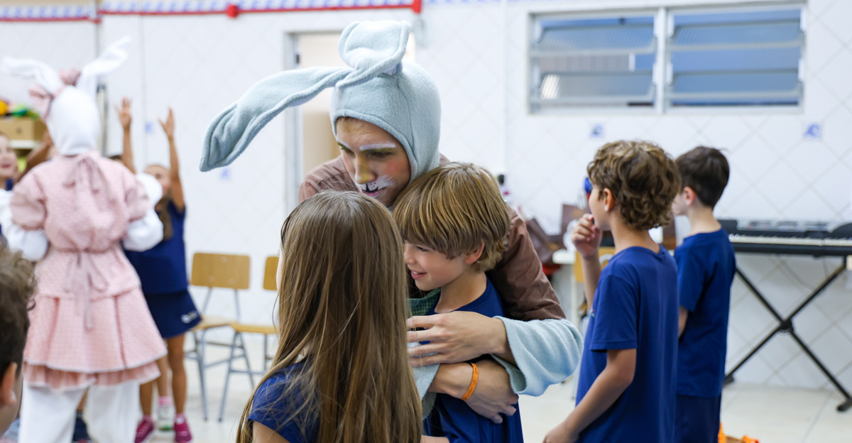 A programação seguiu com a visita do coelhinho e da coelhinha da Páscoa, que percorreram as salas da Educação Infantil ao 5º ano do Ensino Fundamental, promovendo momentos de interação, música e alegria, além de agradecerem todo o empenho dos alunos na campanha Páscoa Solidária, de arrecadação de caixa de bombons.