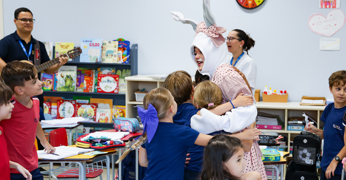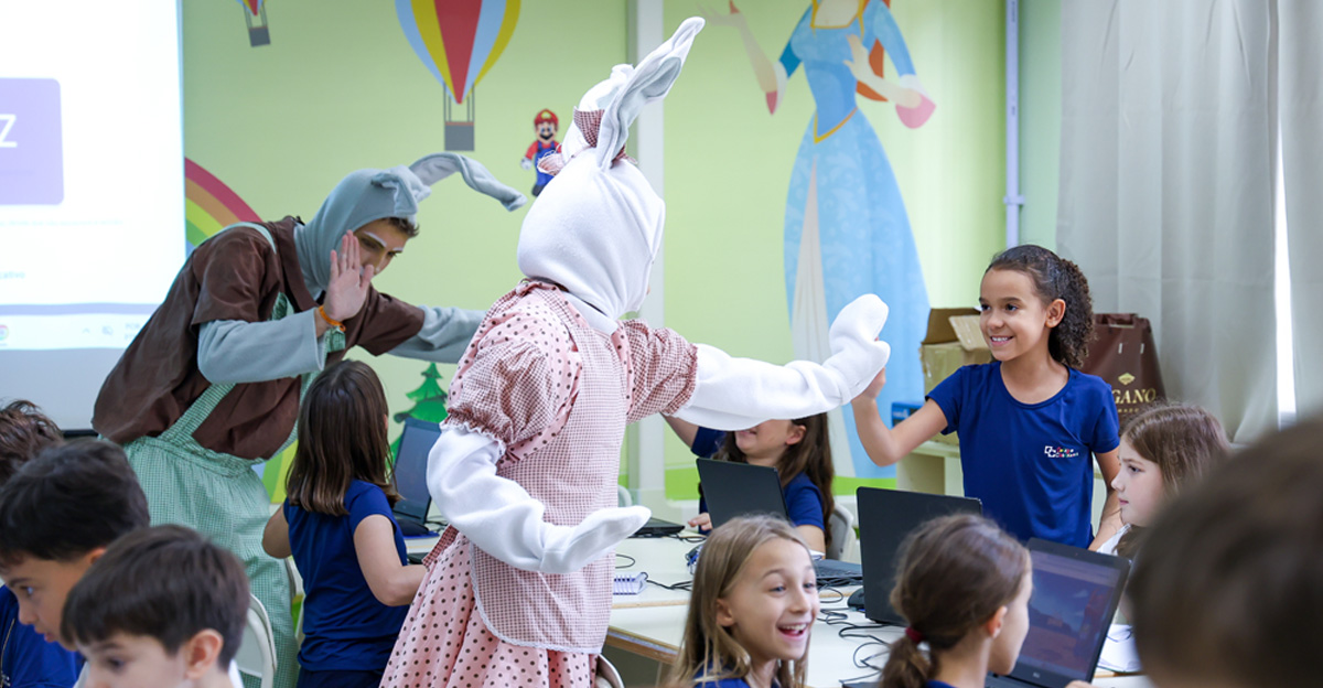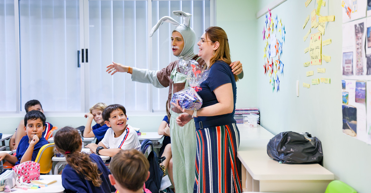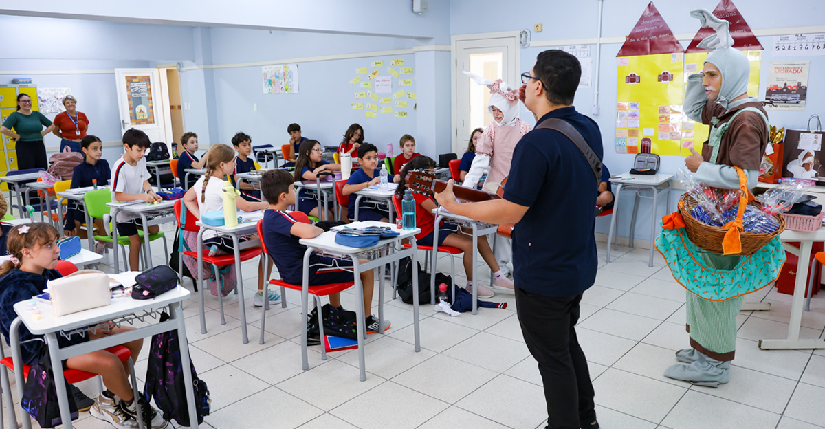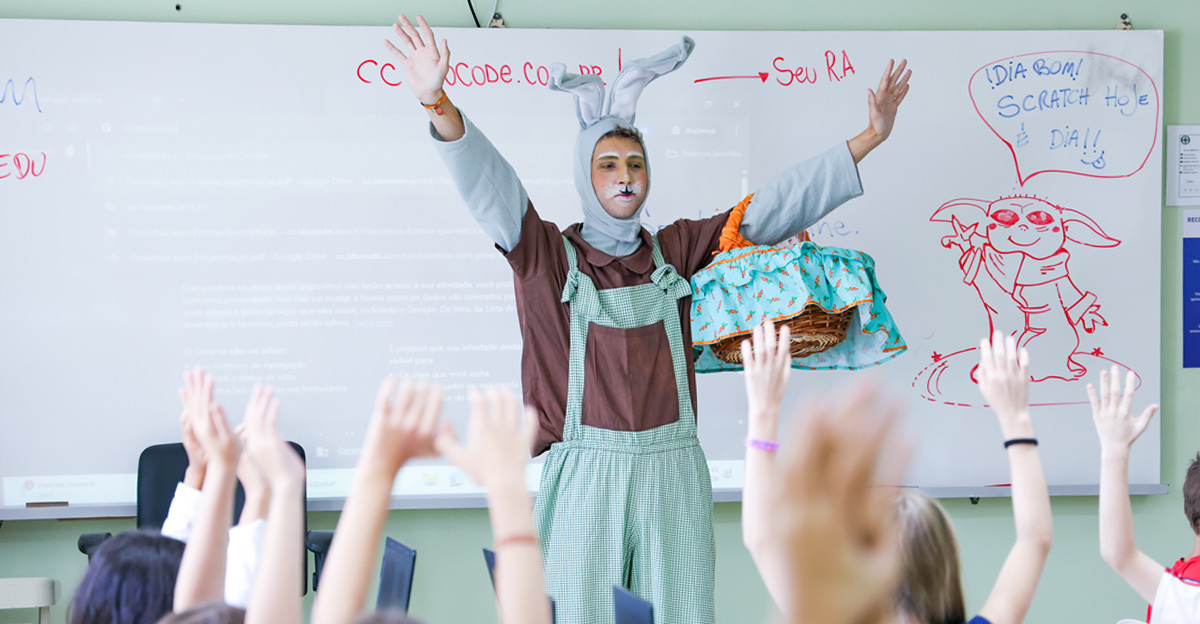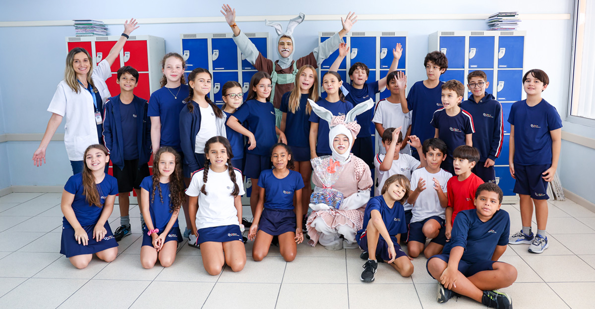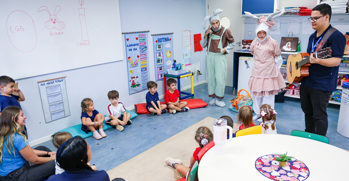 A programação seguiu com a visita do coelhinho e da coelhinha da Páscoa, que percorreram as salas da Educação Infantil ao 5º ano do Ensino Fundamental, promovendo momentos de interação, música e alegria, além de agradecerem todo o empenho dos alunos na campanha Páscoa Solidária, de arrecadação de caixa de bombons.