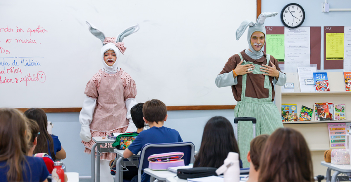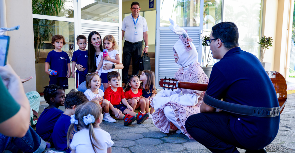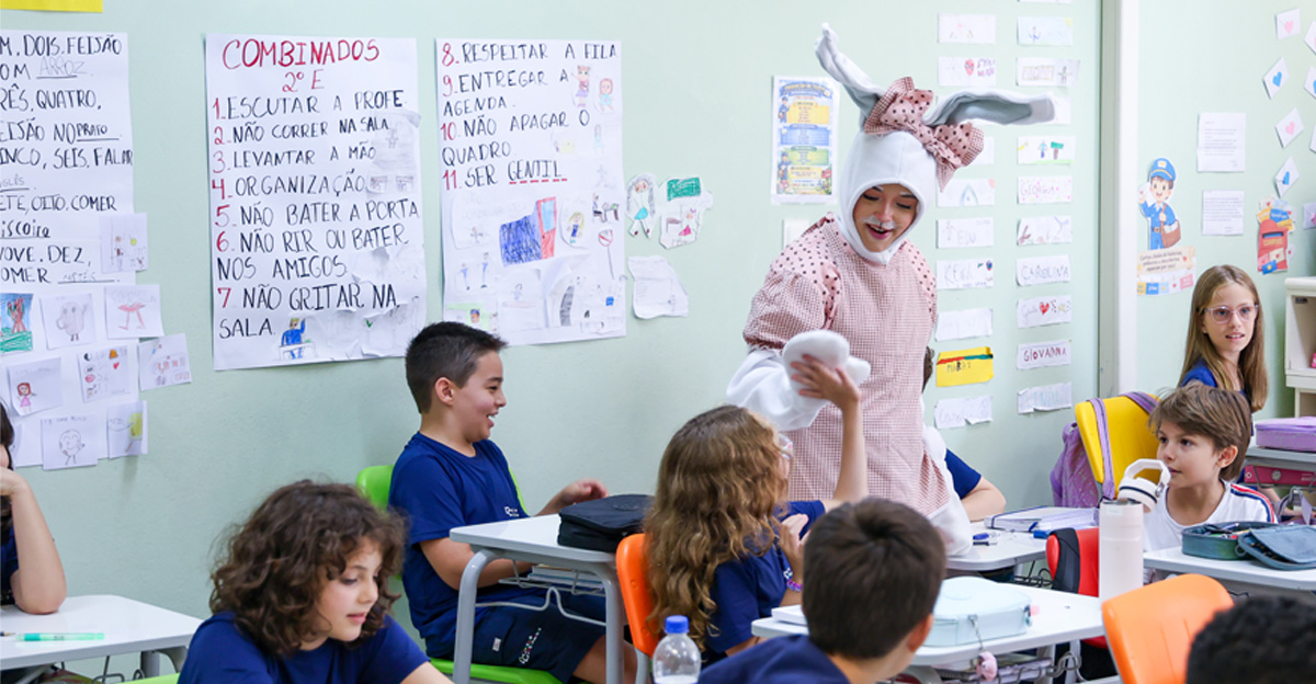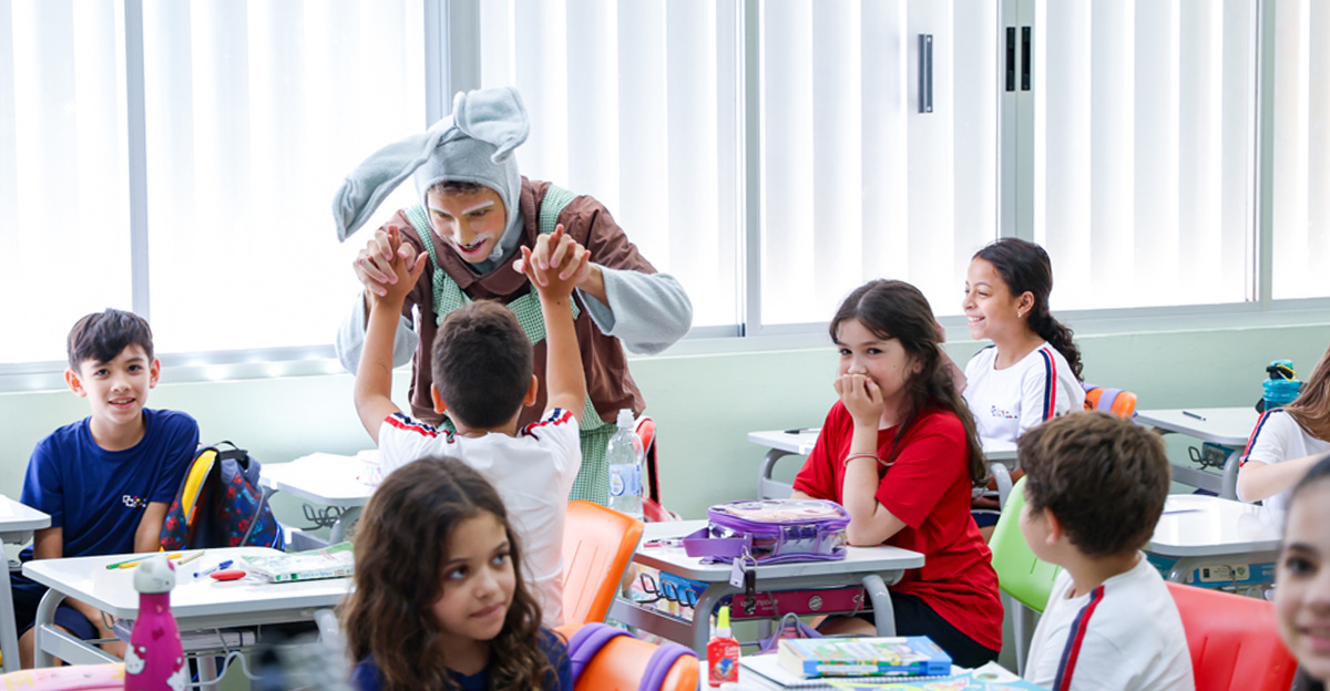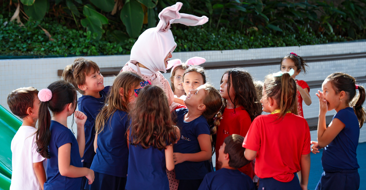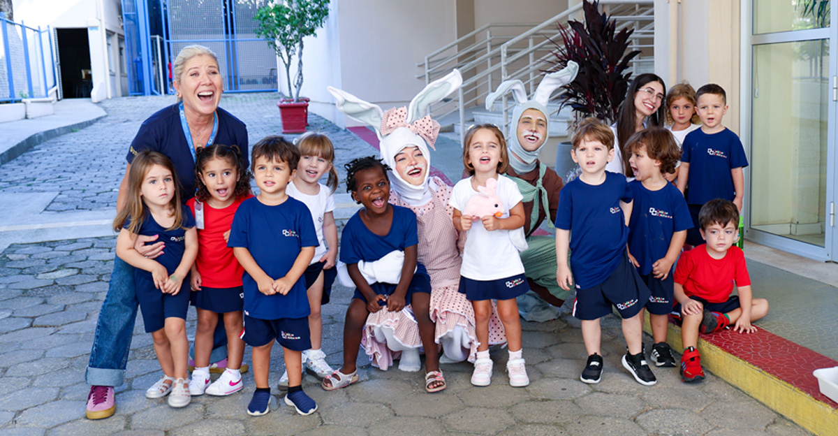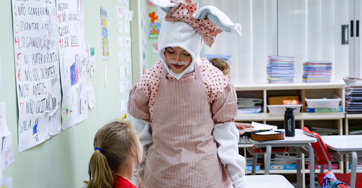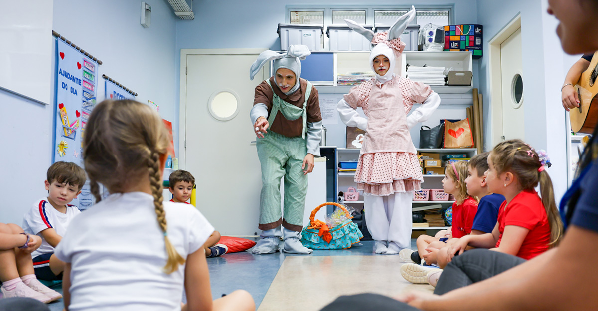 A programação seguiu com a visita do coelhinho e da coelhinha da Páscoa, que percorreram as salas da Educação Infantil ao 5º ano do Ensino Fundamental, promovendo momentos de interação, música e alegria, além de agradecerem todo o empenho dos alunos na campanha Páscoa Solidária, de arrecadação de caixa de bombons.