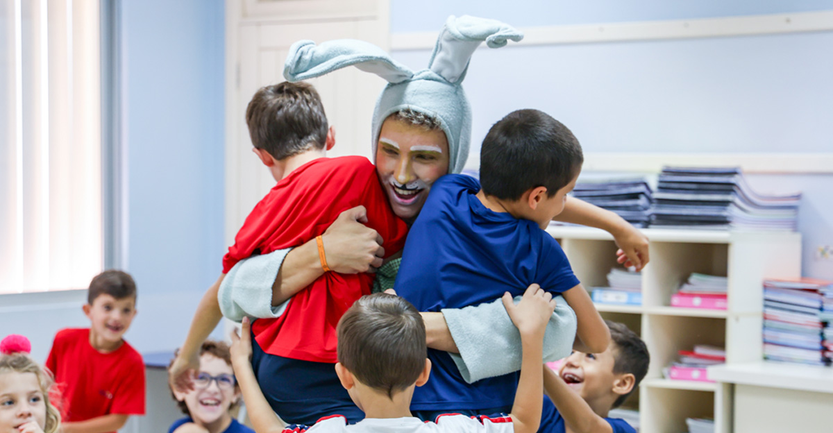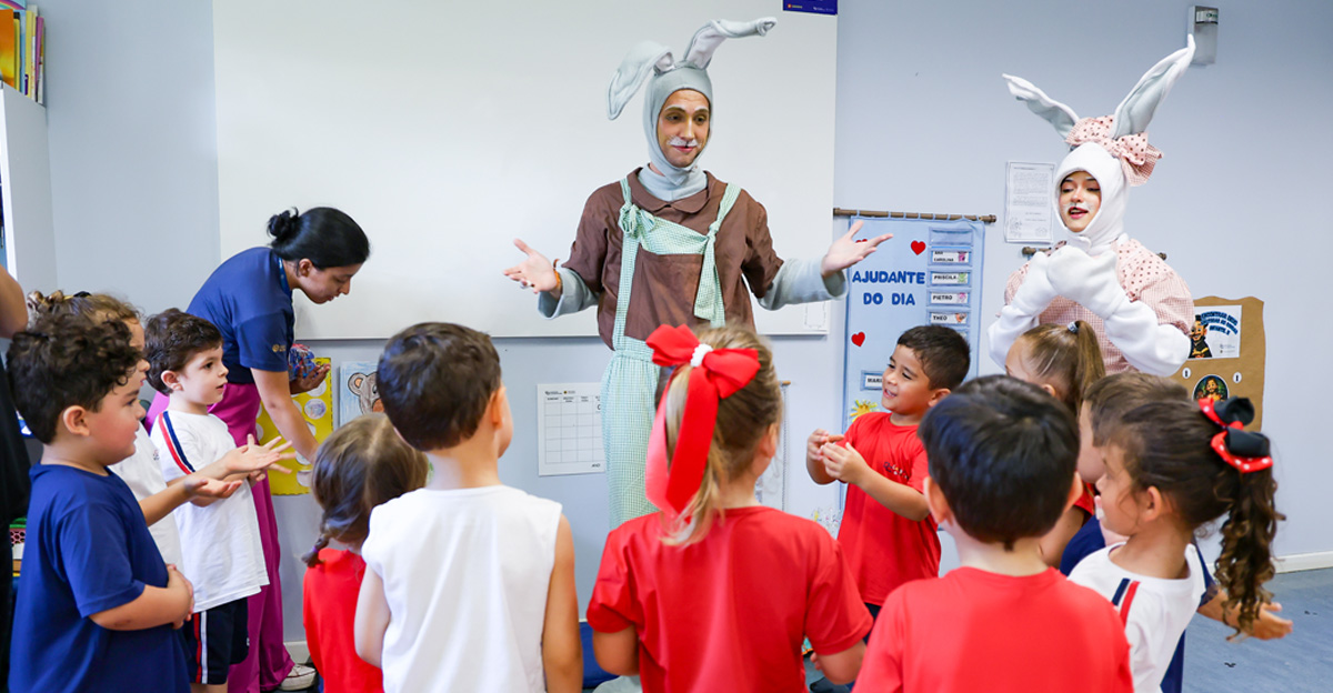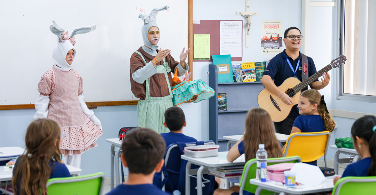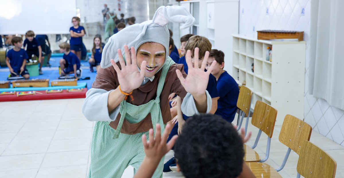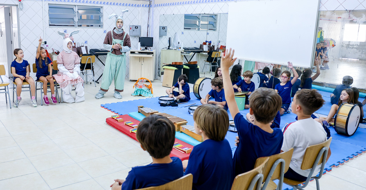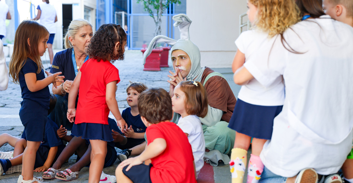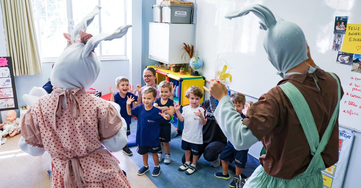 A programação seguiu com a visita do coelhinho e da coelhinha da Páscoa, que percorreram as salas da Educação Infantil ao 5º ano do Ensino Fundamental, promovendo momentos de interação, música e alegria, além de agradecerem todo o empenho dos alunos na campanha Páscoa Solidária, de arrecadação de caixa de bombons.