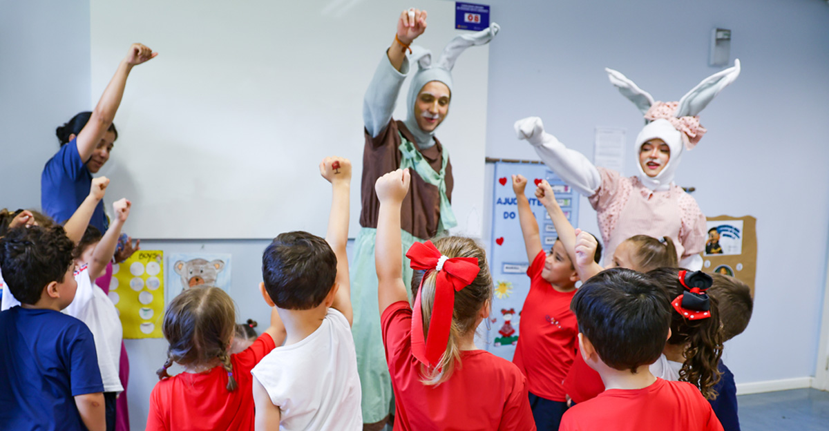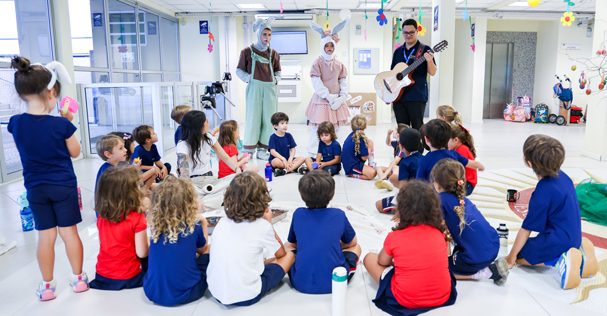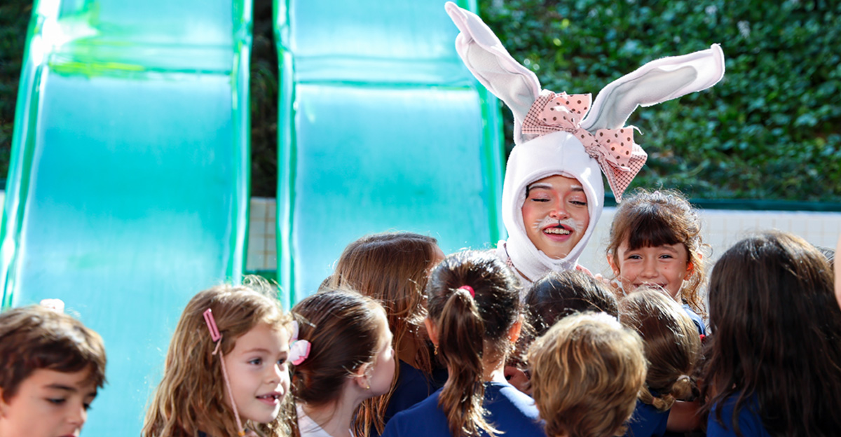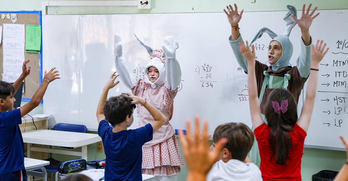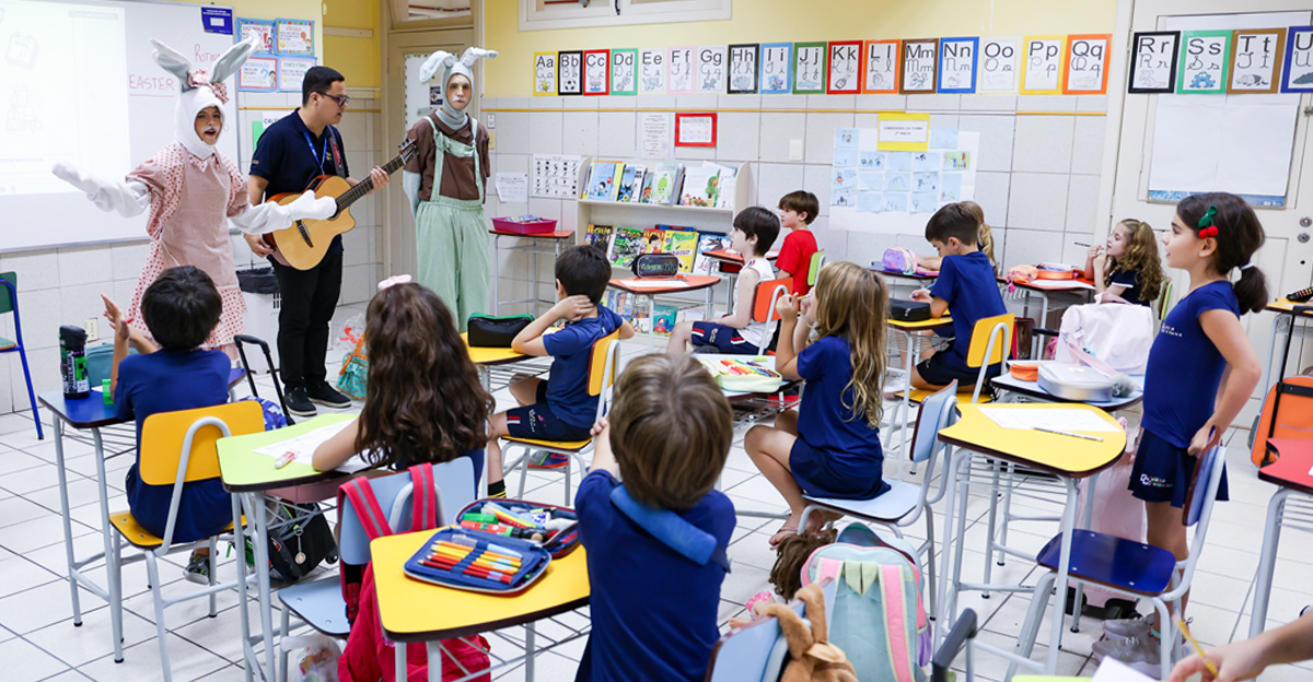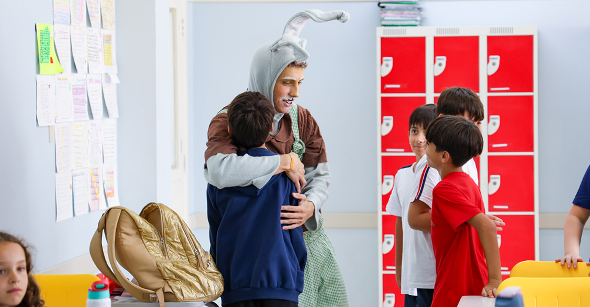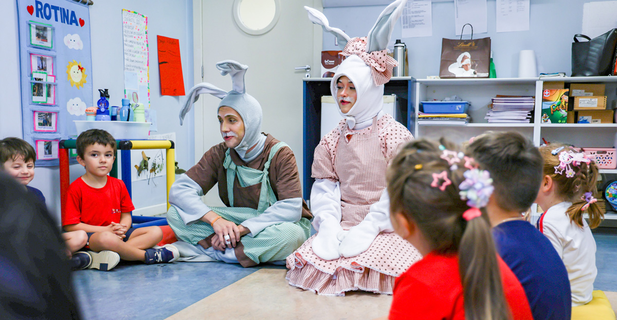 A programação seguiu com a visita do coelhinho e da coelhinha da Páscoa, que percorreram as salas da Educação Infantil ao 5º ano do Ensino Fundamental, promovendo momentos de interação, música e alegria, além de agradecerem todo o empenho dos alunos na campanha Páscoa Solidária, de arrecadação de caixa de bombons.