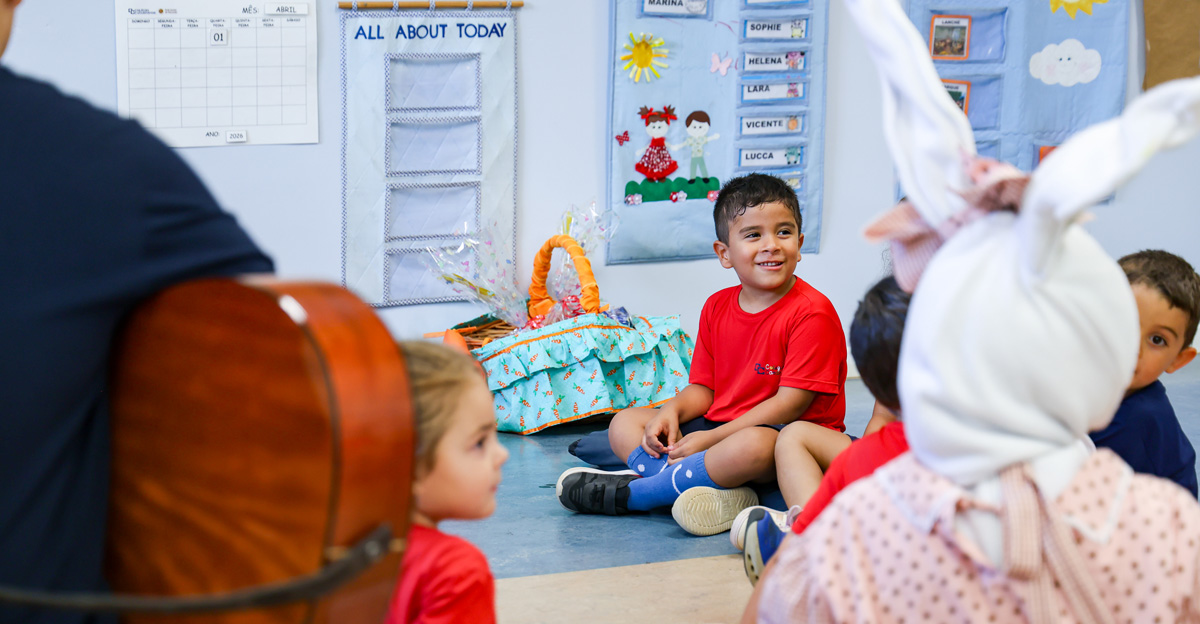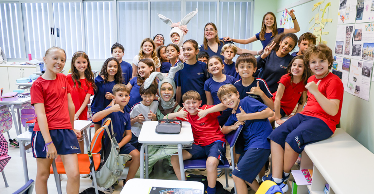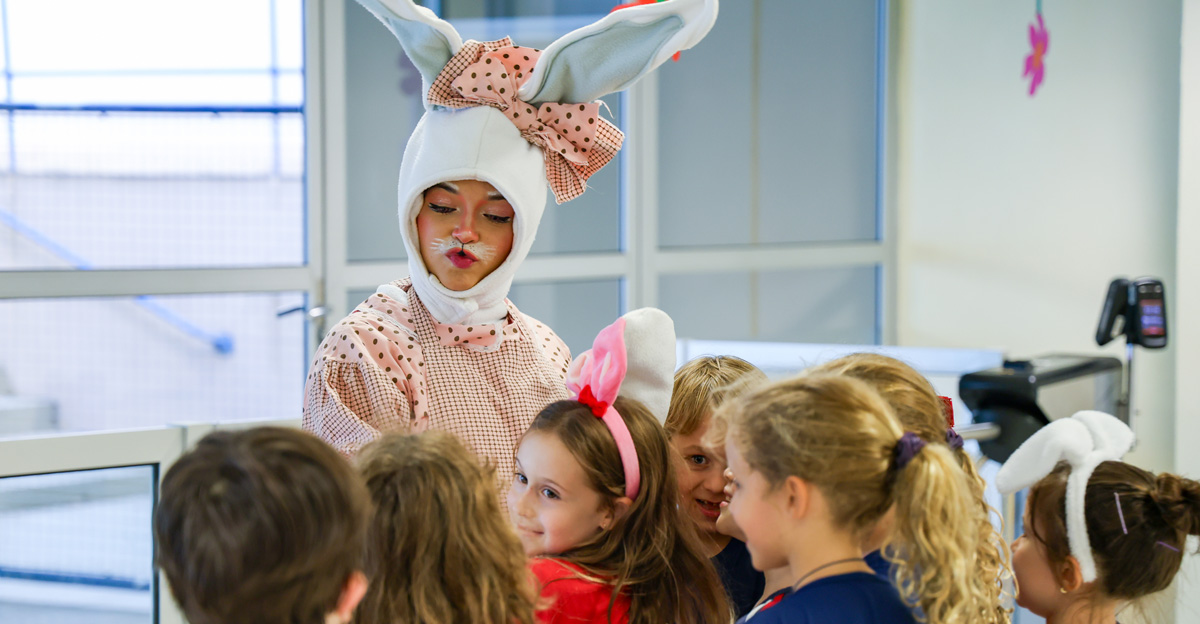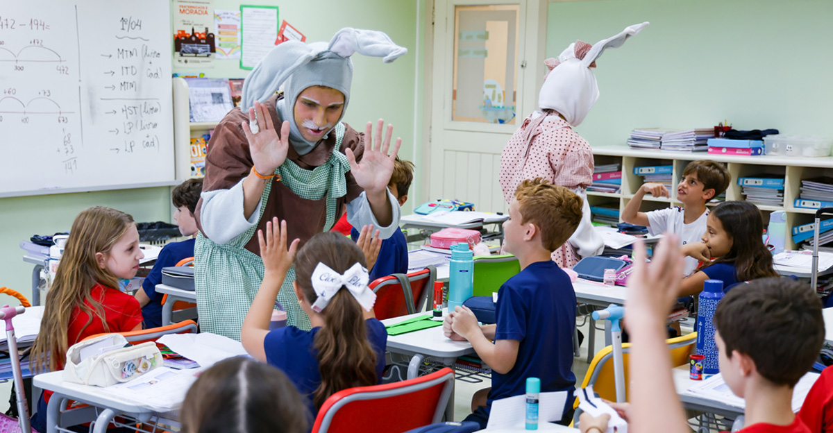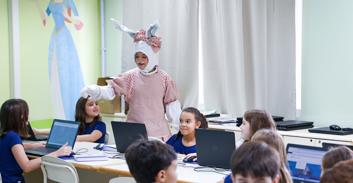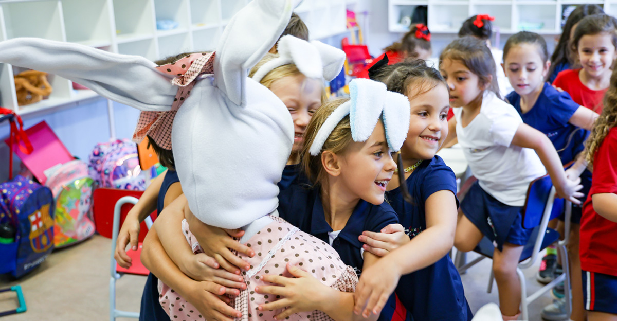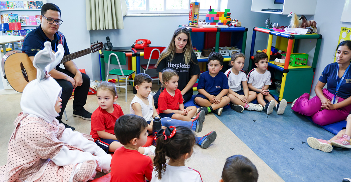 A programação seguiu com a visita do coelhinho e da coelhinha da Páscoa, que percorreram as salas da Educação Infantil ao 5º ano do Ensino Fundamental, promovendo momentos de interação, música e alegria, além de agradecerem todo o empenho dos alunos na campanha Páscoa Solidária, de arrecadação de caixa de bombons.
