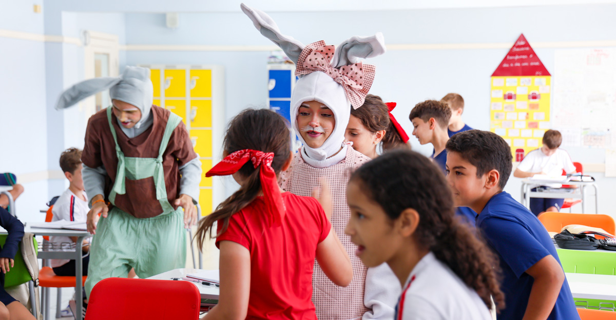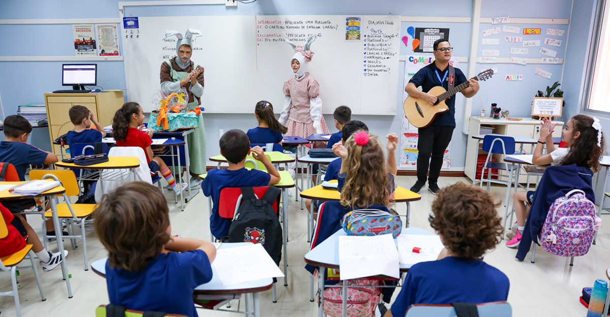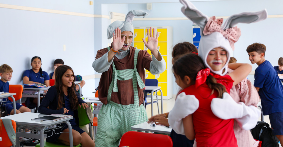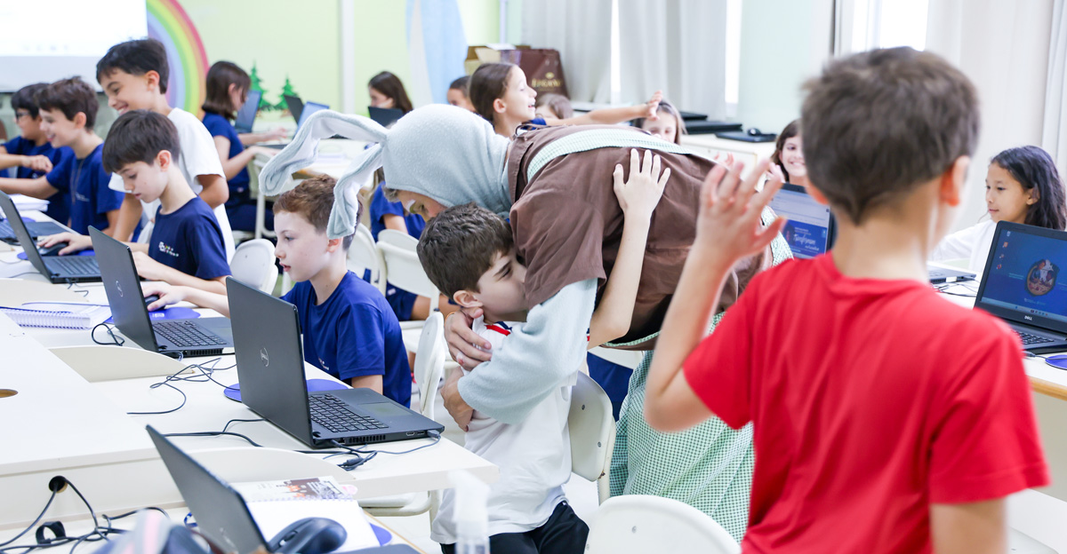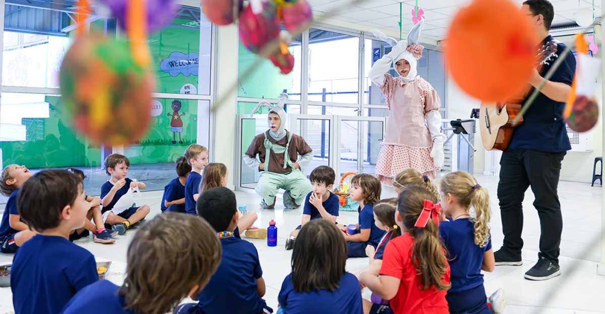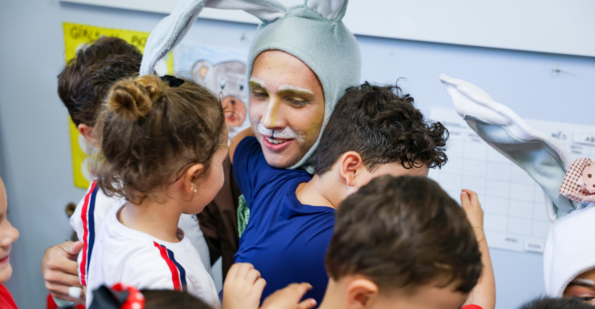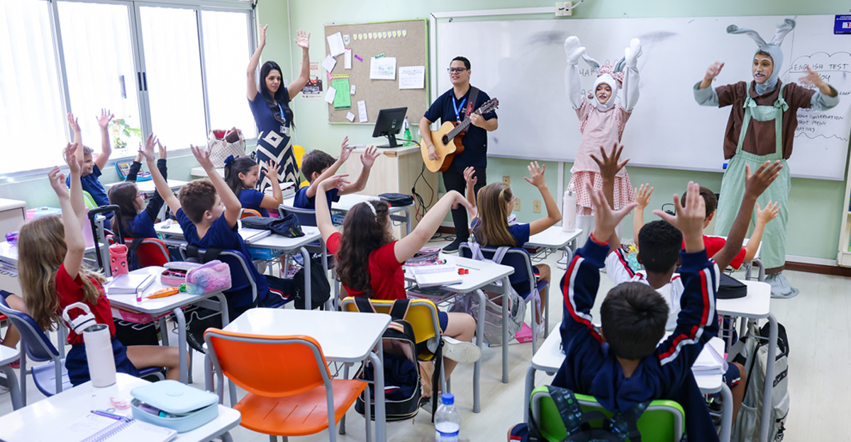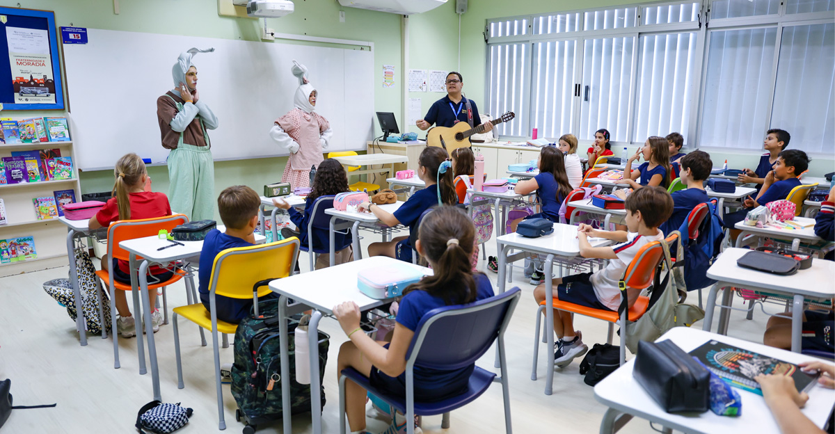 A programação seguiu com a visita do coelhinho e da coelhinha da Páscoa, que percorreram as salas da Educação Infantil ao 5º ano do Ensino Fundamental, promovendo momentos de interação, música e alegria, além de agradecerem todo o empenho dos alunos na campanha Páscoa Solidária, de arrecadação de caixa de bombons.